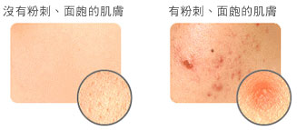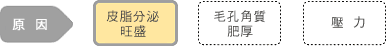 皮脂分泌過剩、毛孔的角質變厚而導致皮脂堵塞。此種初期的粉刺現象會漸漸地受到痤瘡菌的影響而引起發炎、產生紅腫疼痛之現象。