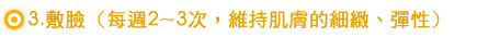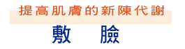 肌膚每天都在新陳代謝,隨著年齡的增長,新陳代謝日益衰退,並沈積許多肉眼看不 見的污垢,敷臉可以體驗保養的立即效果,每週2~3次的敷臉,能將肌膚深層的污垢 去除,恢復肌膚原來的透明感,保持光澤細緻的肌膚。