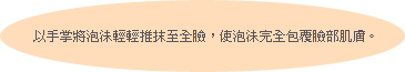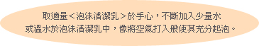 | 每天早晚洗臉時,應如何正確的洗臉呢?先取1~2cm的泡沫清潔乳於手心,加水揉搓出足夠的泡沫後洗臉。足量的泡沫能將臉上不需要的污垢包裹洗去,以清水沖洗時,也能輕易的將肌膚清潔乾淨。搓出的泡沫至少需有一顆蛋大小的程度且泡沫濃密,揉搓泡沫前應先將手部的殘餘油分徹底清洗,並快速的搓出充足的泡沫,以足量泡沫清洗臉部。 | |