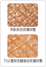 | .gif) 忘了卸粧就直接睡覺後的早晨,是否會覺得皮膚變硬、黏膩、缺乏光澤? 如果每天持續因錯誤的洗臉方式而無法徹底清除污垢時,其狀況就會和沒有卸粧就直接睡覺所招致的結果相同。 而且很可能因而產生粉刺、面皰、小皺紋、皮膚龜裂、沒有光澤、鬆弛等問題。若非經過確實洗臉後的乾淨肌膚,即使使用極高效美容成分的護膚產品,也無法發揮效果。 | |