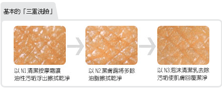 | 早上化粧後經過一整天,到傍晚時皮膚上增加的污垢是您所想像不到的,由於肌膚會分泌皮脂,因而會呈現粉底和皮脂混合的狀態,而汗和空氣中的灰塵、塵土會附著在皮膚上。由於這些污垢的特性不同,若係全部彙集後再去除時會增加皮膚的負擔。所以請使用分別清除的方式,按照步驟仔細的卸粧和洗臉。分三階段實施的方法稱為「三重洗臉」。 .gif) | |